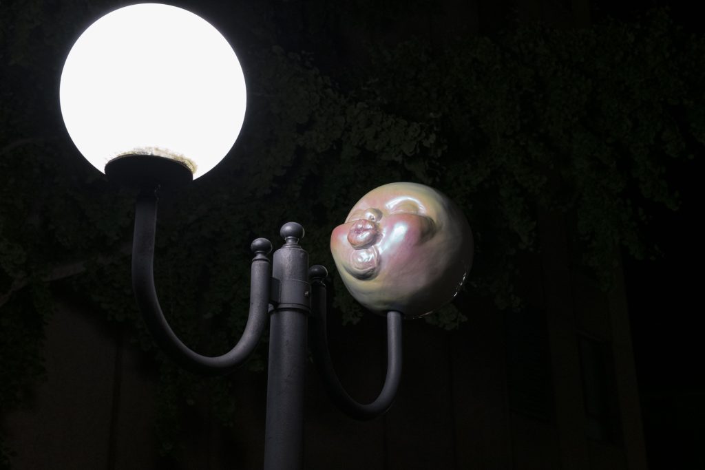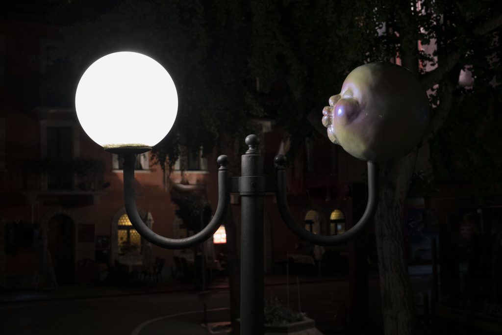 Ausgehend von einer unvollständigen Strassenlaterne im öffentlichen Raum ergänzt die Arbeit Kiss (2024) die fehlende Kugel aus Epoxy durch eine skulpturale Intervention. Die Form erinnert an einen Kopf, der sich der bestehenden Struktur annähert und diese gleichsam „küsst“.
