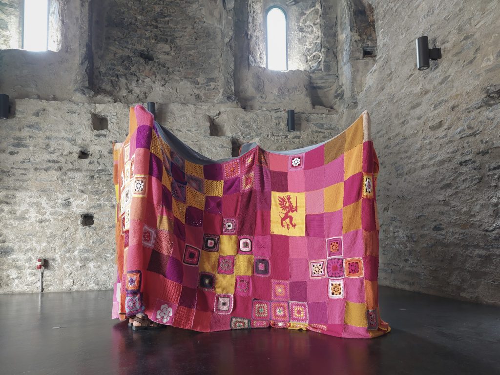 Oma’s Glozzjini ist ein partizipatives Häkel- und Strickprojekt zur Umhüllung der Zinnen des Leuker Schlossturms (2022-2024). Menschen aus der Region und darüber hinaus waren eingeladen, sich mit eigenen Beiträgen zu beteiligen – individuell oder in gemeinschaftlichen Runden.
